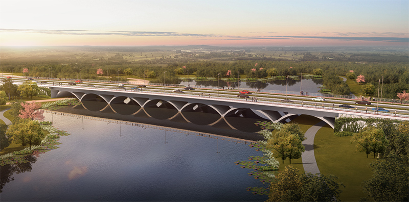 黃河路以“穿透共融、自然綠苑”為設(shè)計(jì)理念,融入自然與城市的生態(tài)廊道、見水見林不見路的景觀綠道。道路兩旁兩側(cè)栽植800多棵高桿櫻花樹,花期在每年3月中旬,觀賞期為15天左右,屆時將成為名副其實(shí)的“櫻花大道”。同時工程包含一座187米的七跨連拱橋,橫跨錦繡東湖,造型優(yōu)美,輕盈靈動。